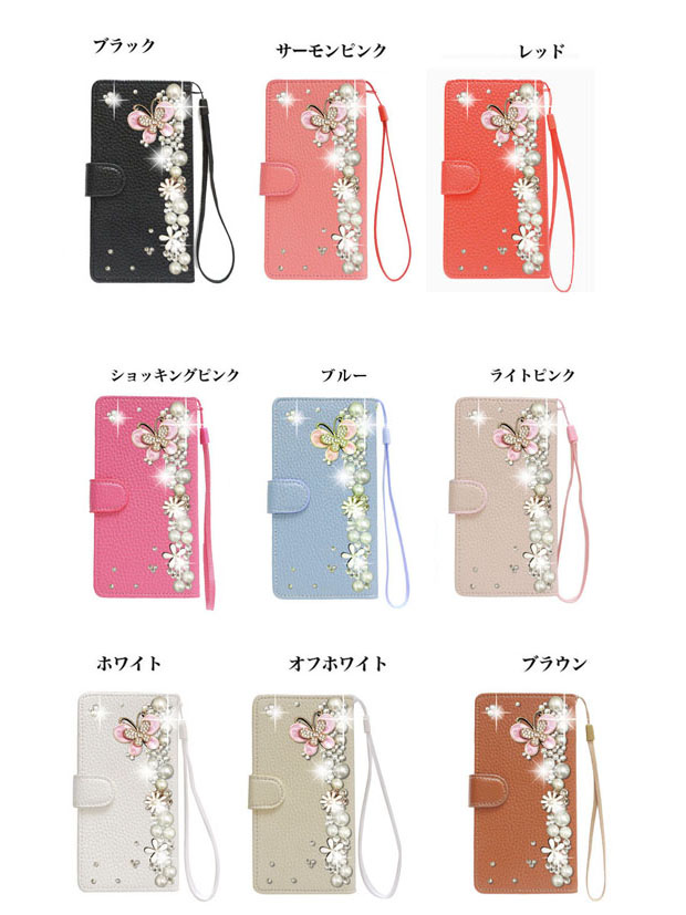 【左利き用】手帳型 スマホケース デコ 蝶 デコ パール キラキラ ストーン