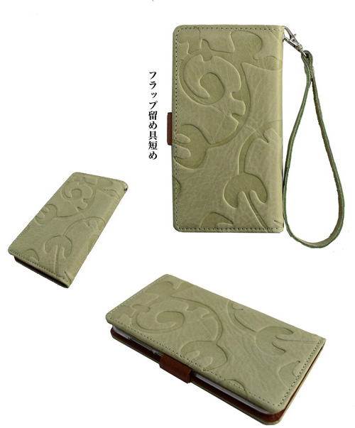 【左利き用】携帯カバー ケース 牛革 ライトグリーン 蔦模様 内面茶色