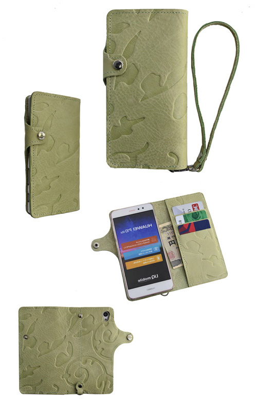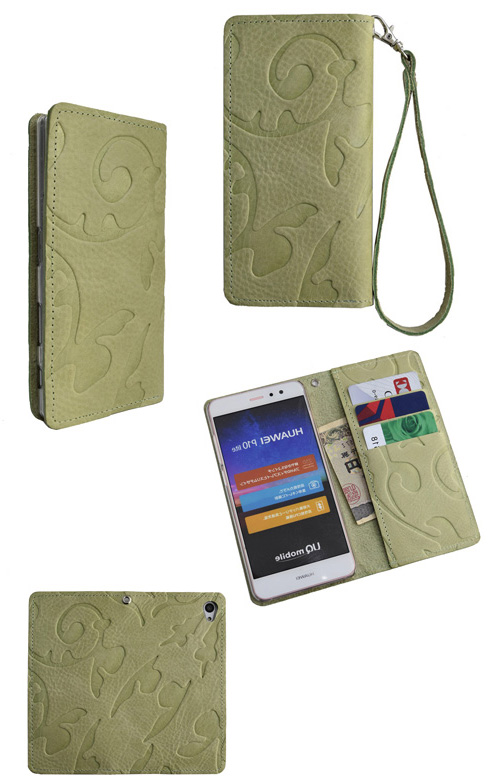 【左利き用】手帳型 スマホケース 本革 明るい 緑 ライトグリーン 型押し
