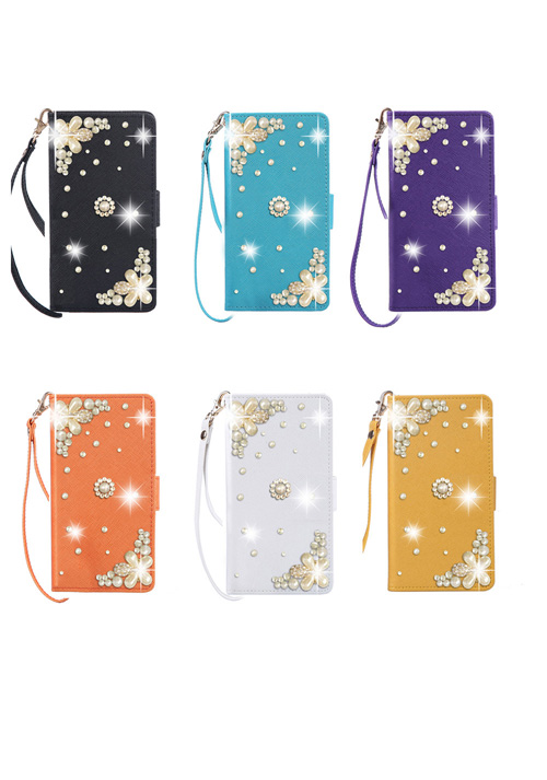 フリップ スマホケース デコ 花 パール ストーン キラキラ紫 黄色 オレンジ 黒 青 白