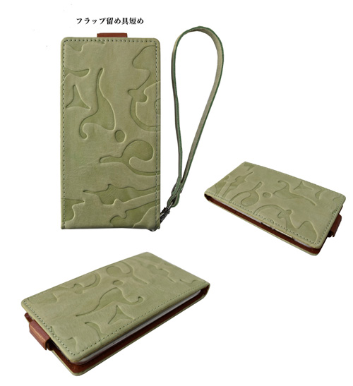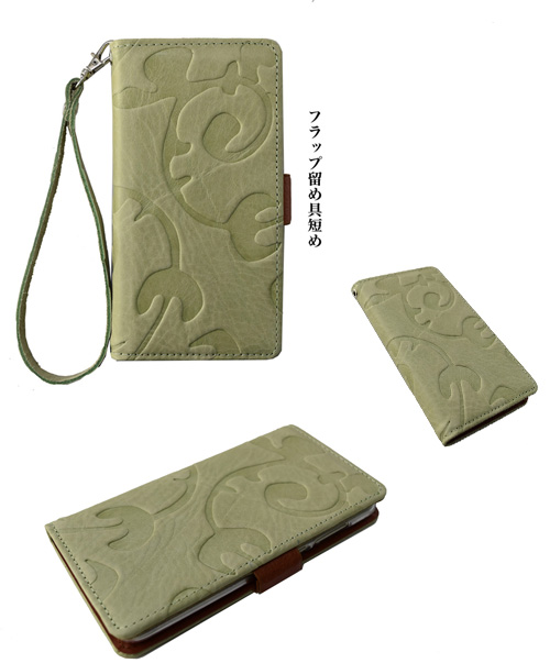 携帯カバー ケース 牛革 ライトグリーン 蔦模様 内面茶色