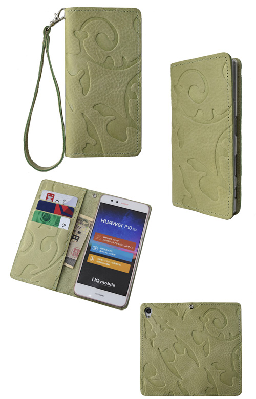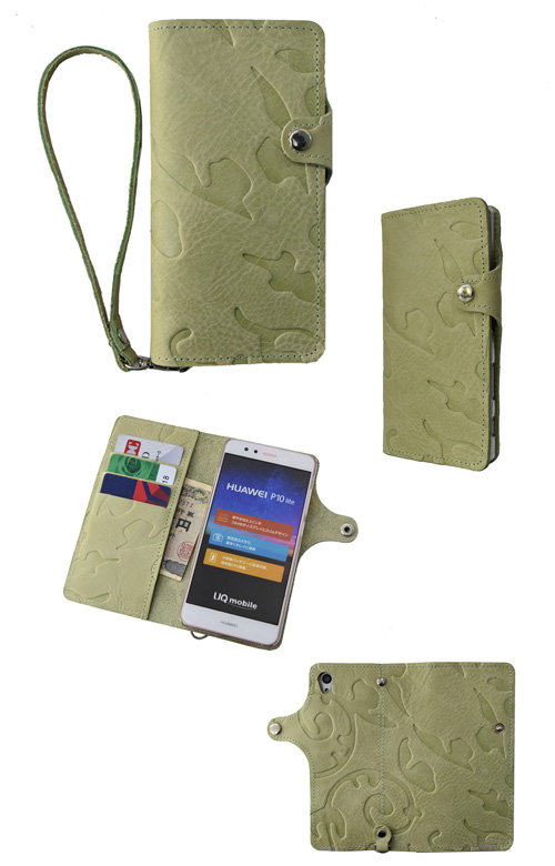 手帳型 スマホケース 本革 明るい 緑 ライトグリーン 型押し