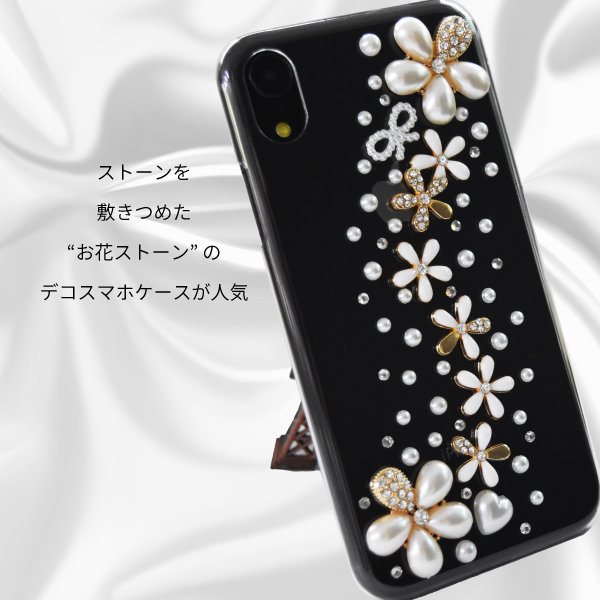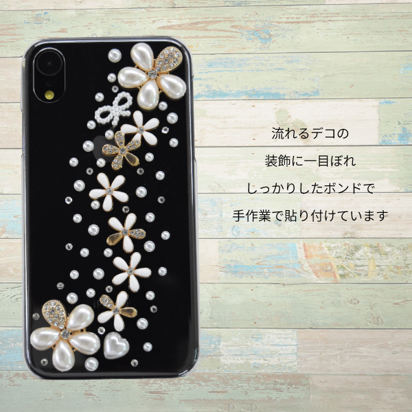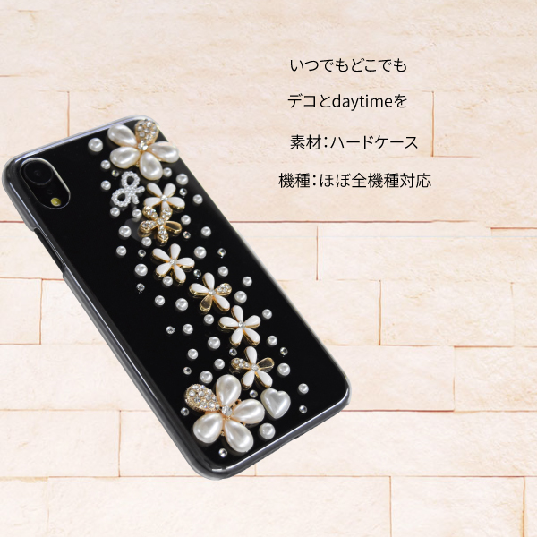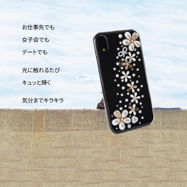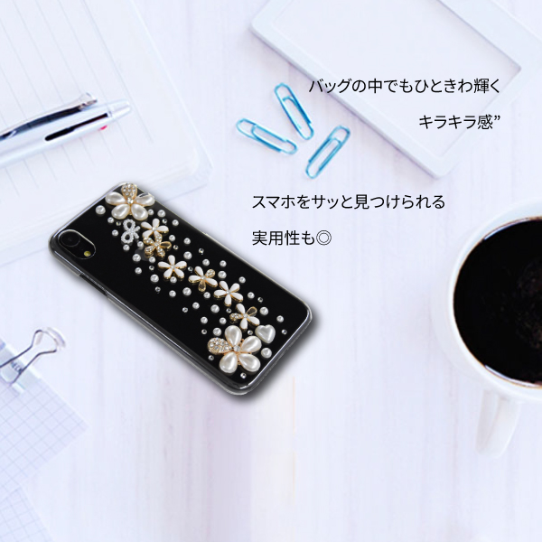 ハードのスマホケースに、フラワー・パール・リボンモチーフのストーンを