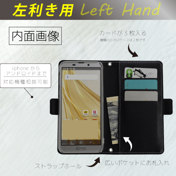 左利き用設計(Left Hand)・手帳型で画面をしっかり保護・カードポケット2つ+広めポケットお財布携帯OKでこれひとつで外出・スタンド式で動画視聴も快適・磁石でしっかり閉じる安心設計ストラップホール付き → お好みのストラップでカスタマイズ可能・カメラ穴あり(ご希望の機種に合わせて製作)・内側はハードケースで安定感◎