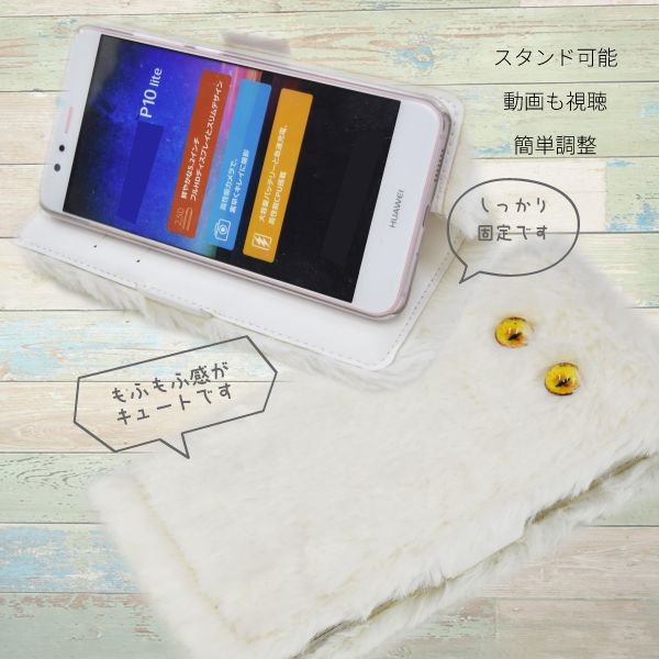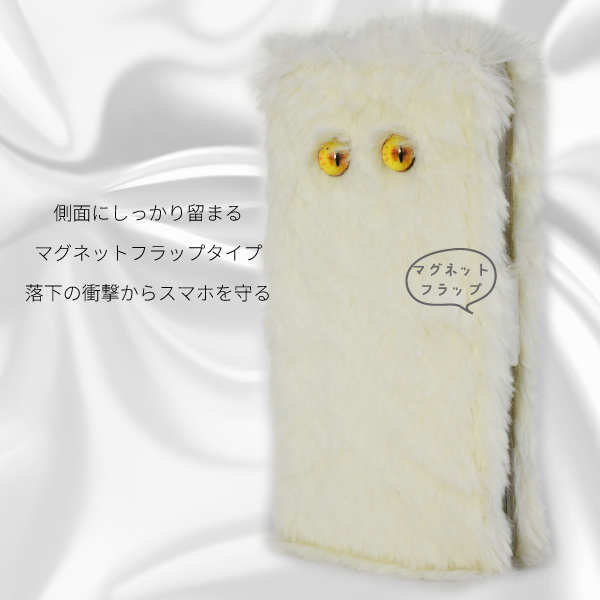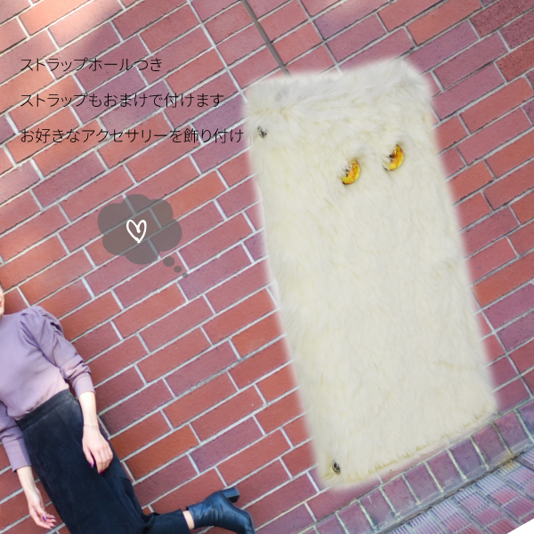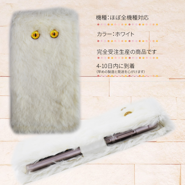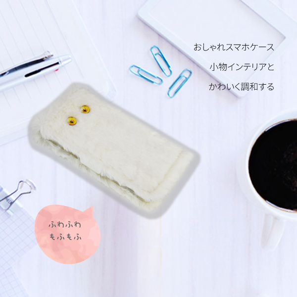 ほぼ全機種対応のふわもこ白ファーのまんまるおめめ手帳型スマホケース ― 触れた瞬間、癒しがはじまる ―