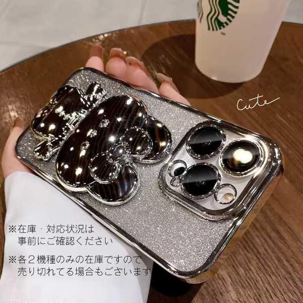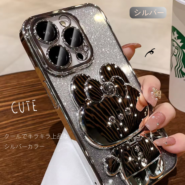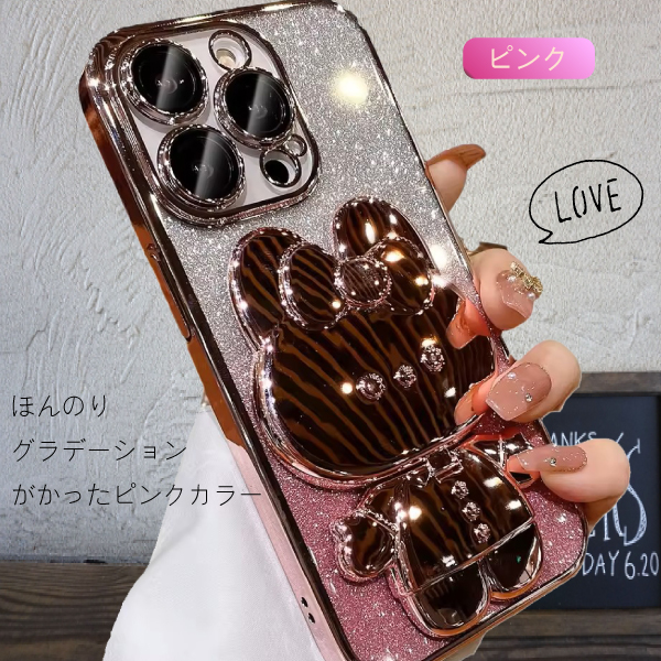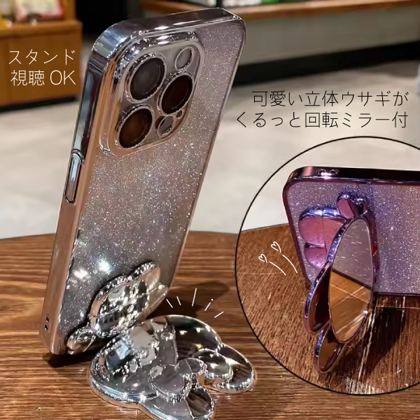 回転ミラー付き きらめきグラデーションラビットiPhoneケース |メッキの立体うさぎフォルム・鏡付き・ラグジュアリー・ピンク/シルバー